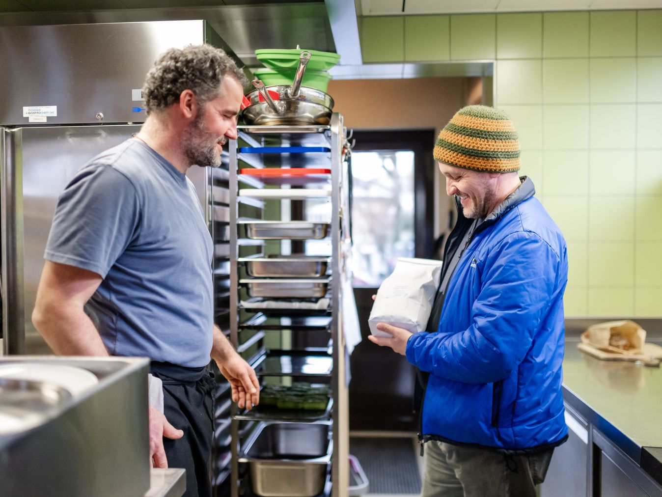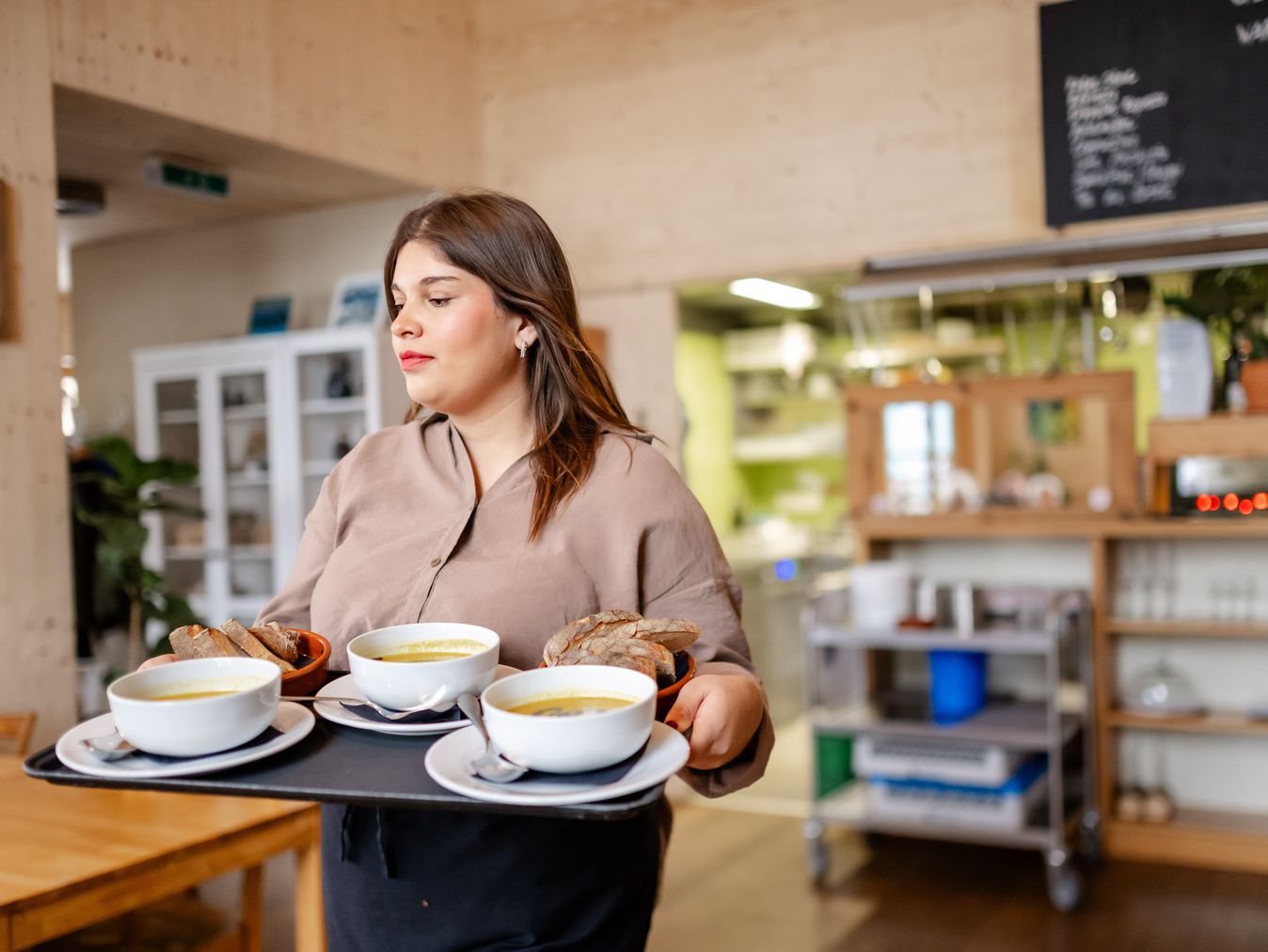 Die moderne Architektur aus viel Holz und grosszügigen Glasflächen wirkt freundlich und einladend. Ein Eindruck, der sich beim Betreten des Restaurants noch verstärkt: der offene, lichtdurchflutete Gastraum spiegelt sich in den Gesichtern und der herzlichen Begrüssung jener Menschen wider, die vor Ort ihren Dienst tun. Küchenchef Fabian Brunner bereitet gerade in der Küche alles für den heutigen Mittagstisch vor, unterstützt von drei Mitarbeiter:innen, die über den Verein für Betreutes Wohnen (VBW) hier eine Arbeitsstelle gefunden haben.