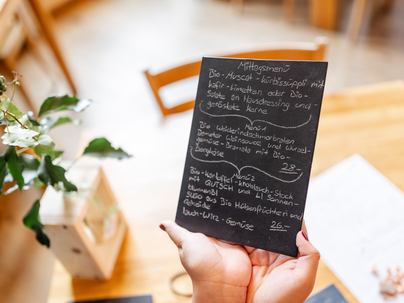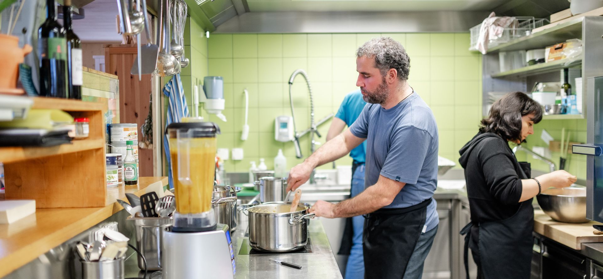Die Mittagszeit rückt näher und ein Blick auf das heutige Speiseangebot lässt einem das Wasser im Mund zusammenfliessen: Muskat-Kürbissüppli mit Kefir-Limetten oder einen Salat an Hausdressing und Kernen als Vorspeise. Danach entweder einen Weiderindschmorbraten mit Wurzelgemüse und Bergkäse oder Kartoffelstock mit Sugo aus Hülsenfrüchten und Getreide sowie Gemüse. Alles ausschliesslich aus biologischer Produktion und aus der Region. „Wir bieten ganz bewusst immer nur zwei Menüs zu Mittag an. Eines davon ist immer vegan, das andere vegetarisch oder – wie heute – auch mit Fleisch“, ergänzt der Küchenchef, bevor er sich wieder seiner Arbeit an Herd und Arbeitsplatte zuwendet.