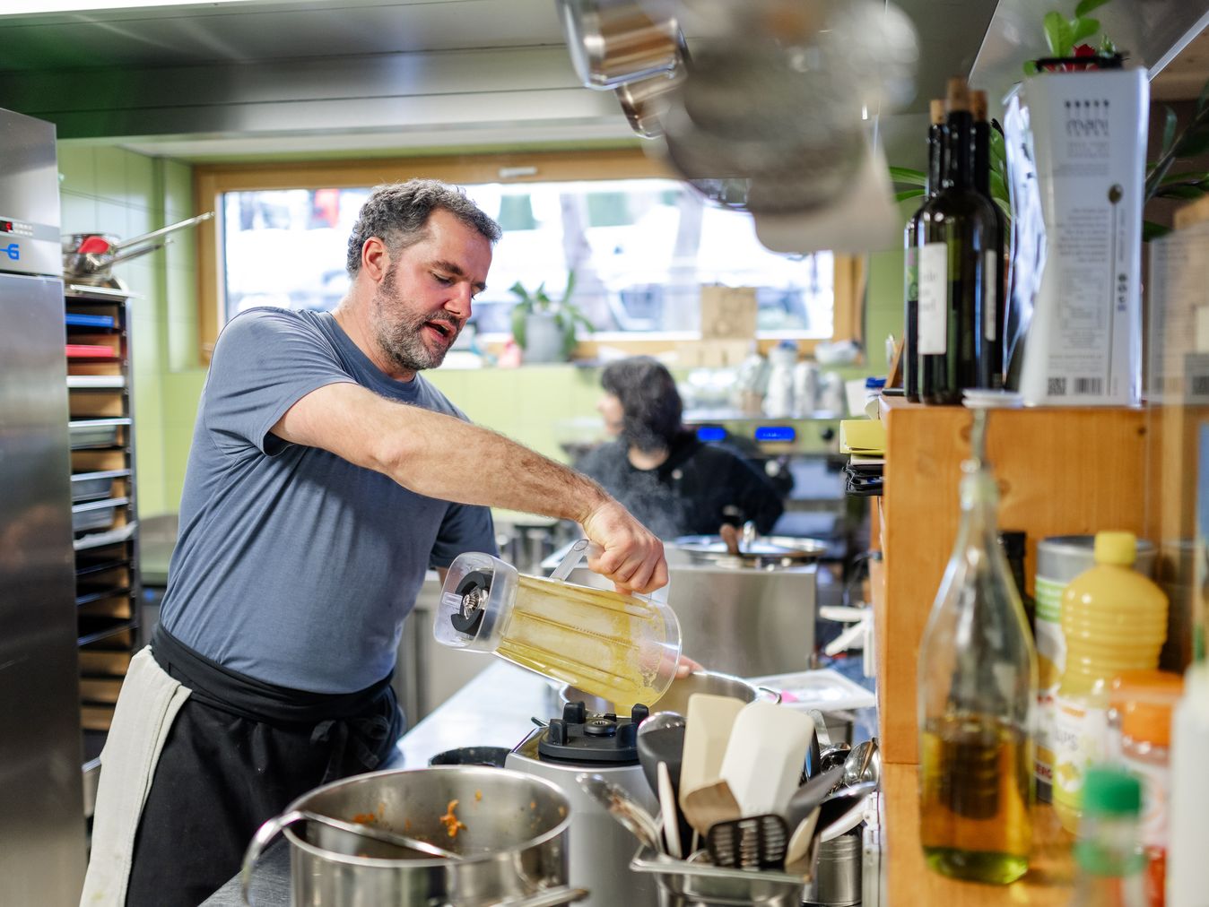 Küchenchef Fabian Brunner, der, während er dem kurzen Gespräch gelauscht hat, unentwegt zwischen Abwasch, Arbeitsplatte und Kühlschrank hin und her gependelt ist, streut seiner Mitarbeiterin ungefragt Rosen: „Ilaha arbeitet sehr selbstständig und ist wirklich eine grosse Hilfe für mich.“ Der gebürtige Toggenburger ist hauptverantwortlich für das besondere kulinarische Konzept, welches das Restaurant zusätzlich auszeichnet. „Ich habe damit hier im Mai 2022 begonnen, verfolge als Koch aber schon seit zehn Jahren eine ganz klare Linie: Ich will wissen, woher meine Zutaten kommen und verarbeite daher nur hochwertige, biologisch produzierte Lebensmittel aus der Region“, gibt der 46-Jährige Einblicke in seine Philosophie. „Wichtig ist mir dabei auch, so wenig wie möglich Abfall zu verursachen. Daher gibt es bei uns unter anderem auch keine unnötigen Riesenportionen – aber dafür jederzeit einen Nachschlag, so oft dies ein Gast wünscht.“