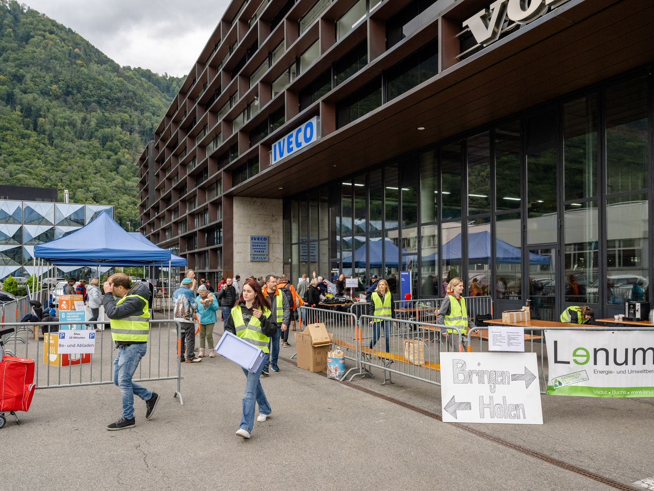 „Die erste Stunde ist immer die heftigste“, stöhnt Alannah Ospelt, eine der Signalwesten-Träger:innen, als sie sich mit einem Karton Geschirr zum Zelt mit der Aufschrift „Haushalt“ durch die Menge schlängelt. Die junge Vaduzerin hat bereits bei der Premiere des „Bring- und Holtages“ 2018 mitgeholfen. Heute – mit gerade einmal 18 Jahren – ist sie die Projektleiterin. Gemeinsam mit anderen freiwilligen Mitarbeiter:innen der Lenum AG sorgt sie für den reibungslosen Ablauf vor Ort.