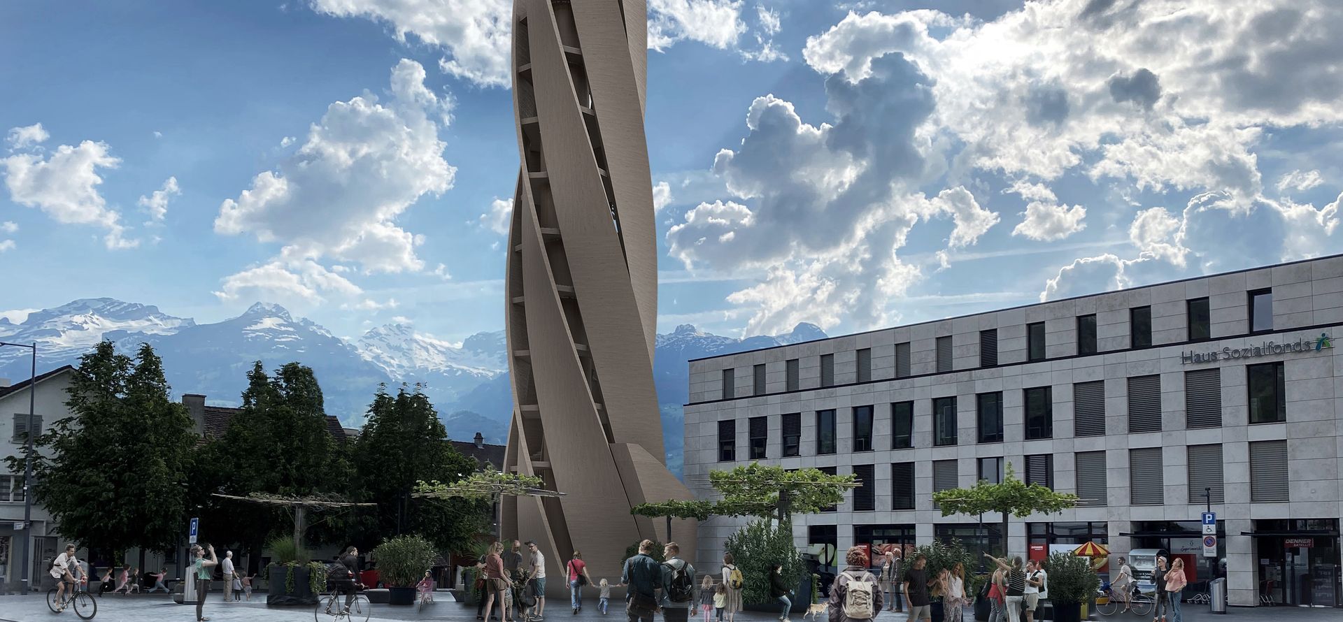 Die Besucher:innen begeben sich im Turm auf eine individuelle Reise und erleben die Ausstellungsthemen in interaktiven Formaten, bis sie schliesslich im 10. Stock auf der Aussichtsplattform ankommen, wo sich ihnen der Blick auf Liechtenstein und die Region eröffnet.