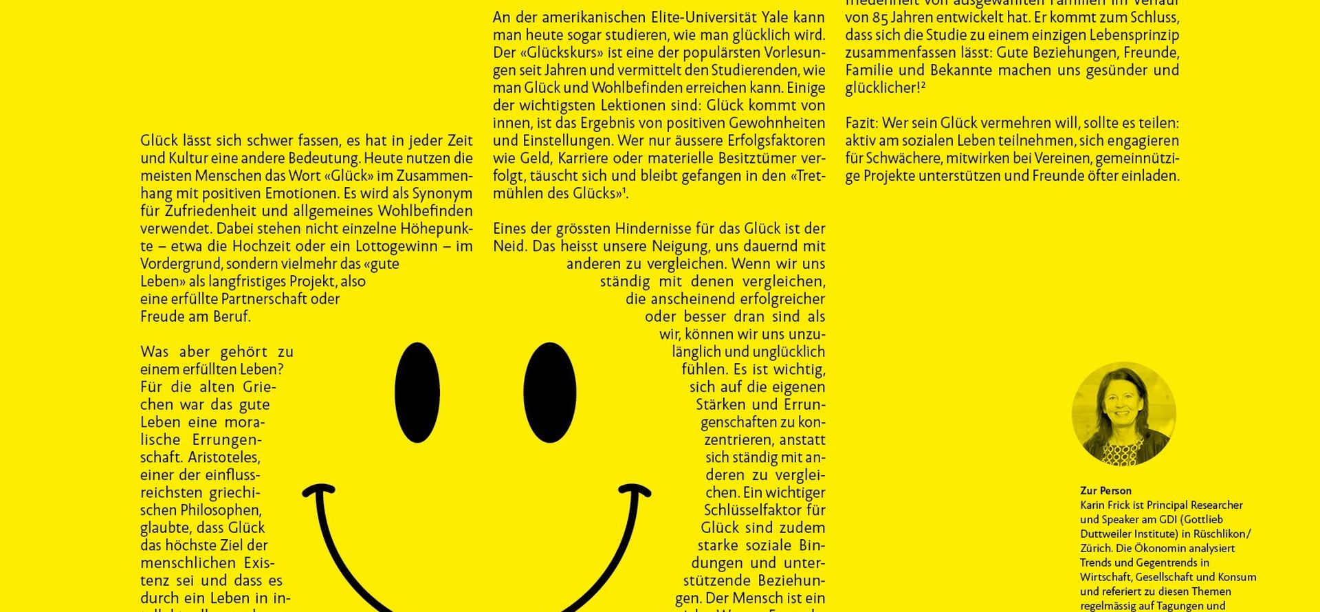 An der amerikanischen Elite-Universität Yale kann man heute sogar studieren, wie man glücklich wird. Der «Glückskurs» ist eine der populärsten Vorlesungen seit Jahren und vermittelt den Studierenden, wie man Glück und Wohlbefinden erreichen kann. Einige der wichtigsten Lektionen sind: Glück kommt von innen, ist das Ergebnis von positiven Gewohnheiten und Einstellungen. Wer nur äussere Erfolgsfaktoren wie Geld, Karriere oder materielle Besitztümer verfolgt, täuscht sich und bleibt gefangen in den «Tretmühlen des Glücks»1.